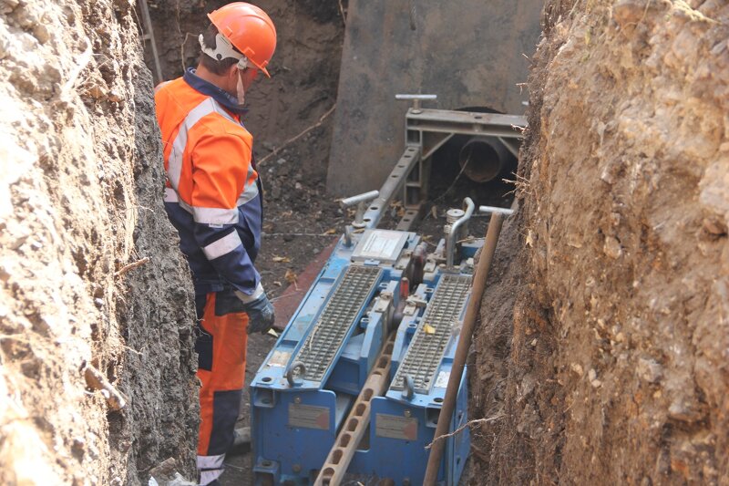 Бестраншейный метод внедрили в работу всего три года назад, но он становится всё более технически популярным. Трубы помещаются в заводные котлованы и проталкиваются с помощью специального оборудования. В условиях большого города это значительно сокращает неудобства для жителей и экономит ресурсы предприятия.