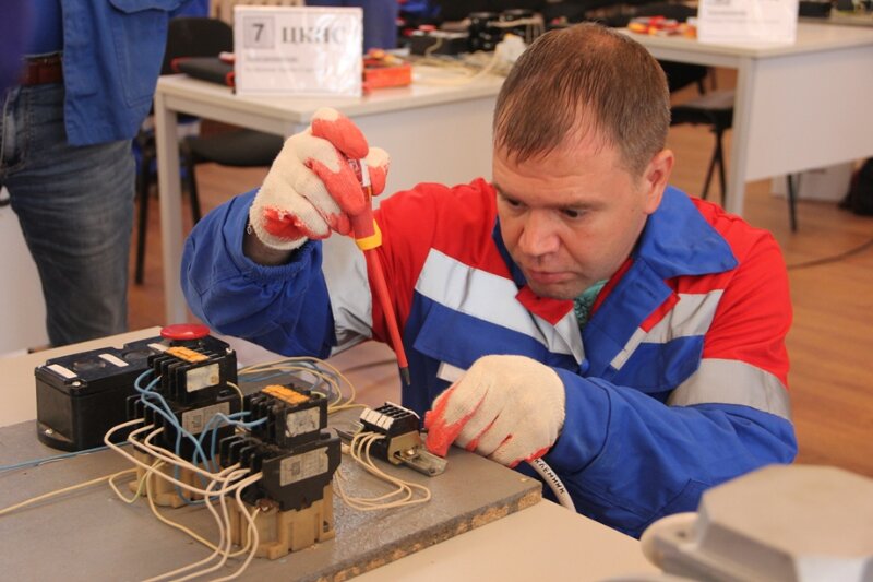 Основным заданием на конкурсе стал монтаж электрической схемы прямого и реверсивного пуска асинхронного электрического двигателя. Работа длилась больше часа, необходимо было собрать и подключить провода и кабели по предложенной схеме. Справились не все и не сразу, некоторым участникам пришлось поработать над ошибками. Комиссия проверяла всё: работоспособность устройства, соблюдение правил охраны труда, наличие всех средств защиты, аккуратность исполнения и чистоту рабочего места.