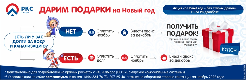 У «РКС-Самара» есть своя хорошая привычка – благодарить добросовестных абонентов. Ежегодно, в канун новогодних праздников ресурсоснабжающая организация проводит акцию «В Новый год – без долгов». Каждый участник акции может рассчитывать на небольшой приятный подарок. Для участия в акции надо не иметь долгов, или оплатить их до 28 декабря, и оплатить авансом декабрьскую квитанцию, равную начислениям ноября. Получить подарок можно во всех центрах обслуживания «РКС-Самара» с 1 по 28 декабря, предъявив квитанции об оплате. Те, кто не пришёл за подарком, могут получить 100 рублей скидки на январский платёж.